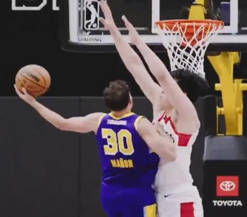 第二节比赛,混音有意识地给杨瀚森安排专属的战术,队友狄龙·琼斯也会招呼杨瀚森落到低位,给他喂球。