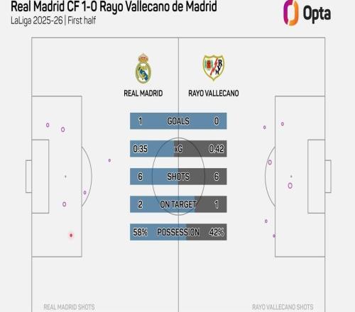 西甲第22轮,皇家马德里主场对阵巴列卡诺,上半场战罢,皇马1-0领先,皇马在上半场仅完成6次射门,为球队本赛季主场比赛上半场第二少。